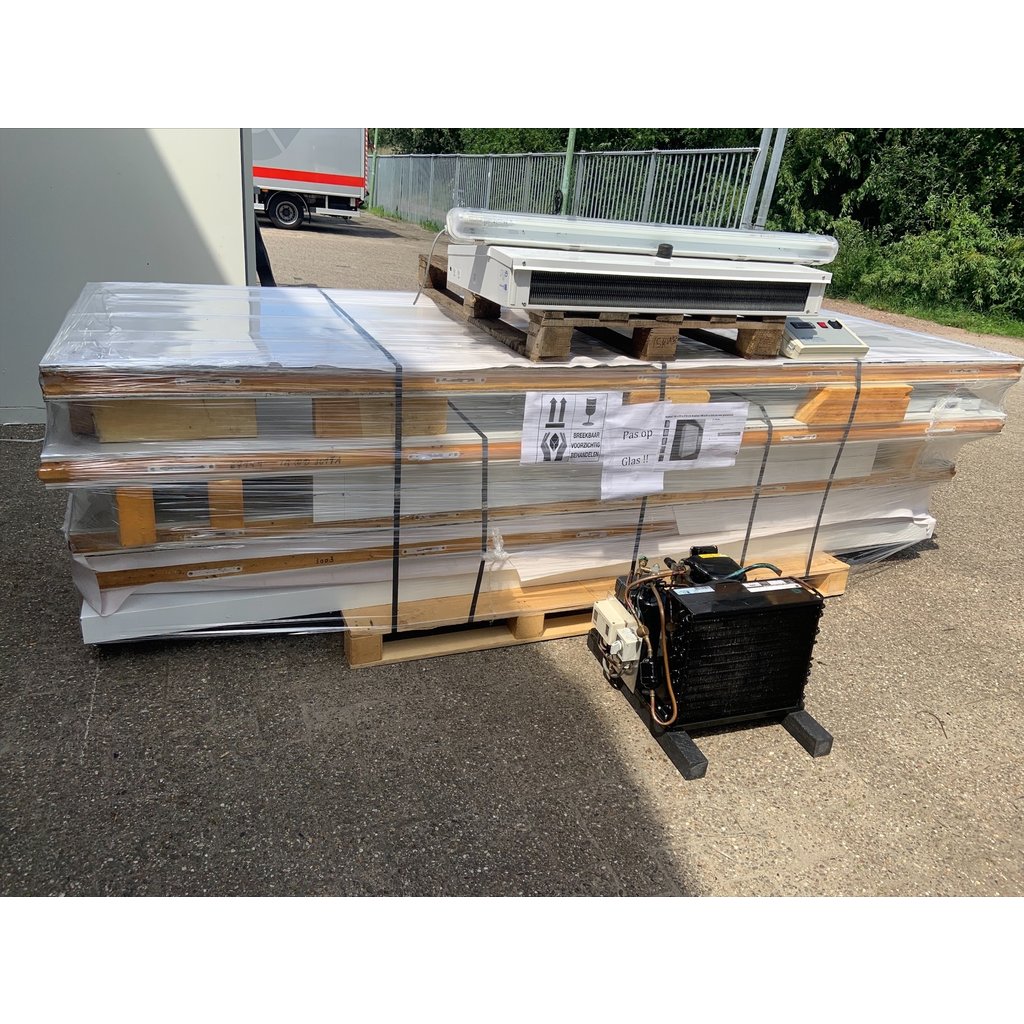 De koelcel is gedemonteerd en verpakt op een pallet dus klaar voor transport